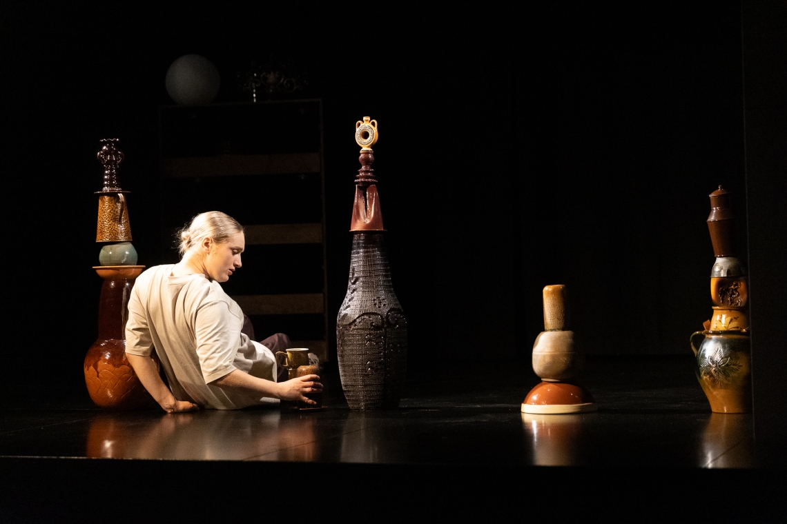 Scenogrāfijas centrā ir māla trauki kā simbols cilvēka emocionālās pasaules trauslumam un spēkam, kā satvars emocijām un asarām, kas tos piepilda un nereti iet pāri malām, vai dusmās plīst.