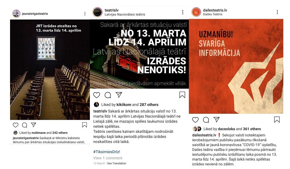 Izsludinot ārkārtas stāvokli valstī saistībā ar COVID-19, viens no punktiem bija – “aizliegt visus publiskos pasākumus, sapulces, gājienus un piketus virs 200 cilvēkiem” [8]. Twitter kopiena vēl nebija izdiskutējusi katra teātra zāles ietilpību, kad teātri viens pēc otra paziņoja, ka līdz ārkārtas stāvokļa beigām tiek atceltas izrādes visās zālēs.