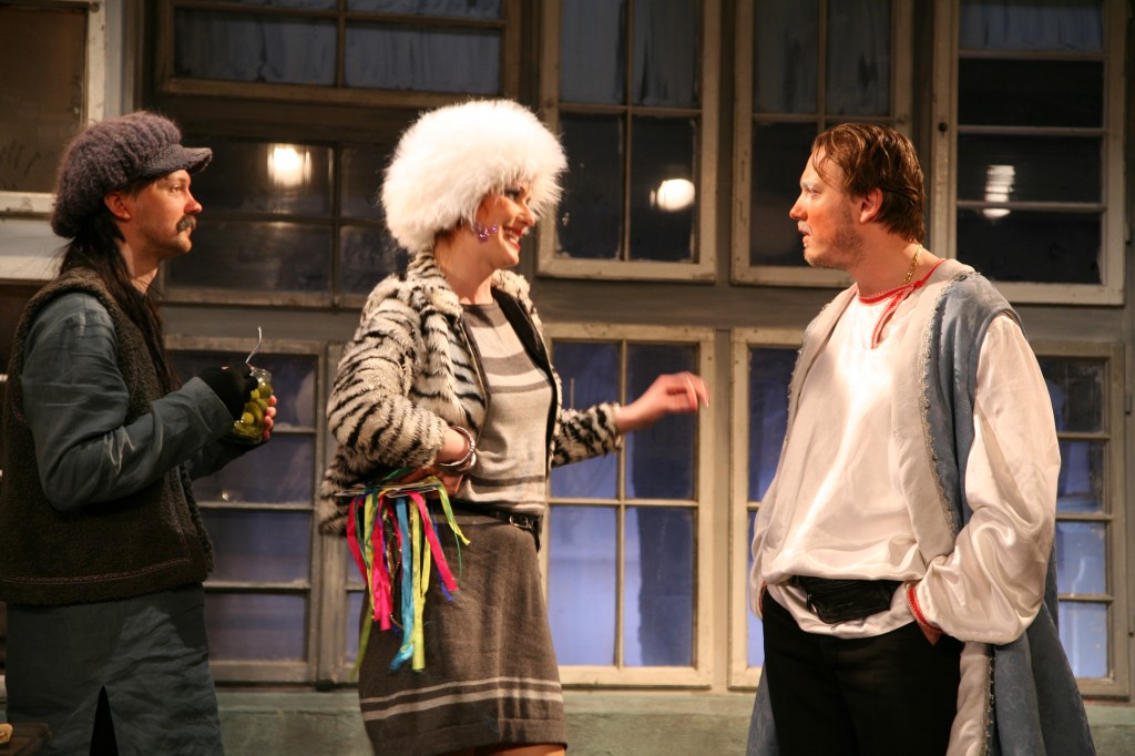 Izrādes sarežģījuma punktā ierodas tāda kā klejojošu mākslinieku trupa, kas svētku sezonā „nogāž” vienu eglīti pēc otras (Salavecis un Sniegbaltīte Mārtiņa Liepas un Ilzes Lieckalniņas izpildījumā, Aigara Apiņa Akordeonists, viņiem nesen piebiedrojusies Rutas Birgeres Večiņa). Pēc skaļās un jautrās kompānijas iniciatīvas varoņi uzsāk tostu spēli, kas izvēršas par pamatīgu dzerstiņu un kolektīvu dvēseles izkratīšanu. Režisore to izmanto, lai pievērstos cilvēka sarežģītās iekšējās pasaules un savstarpējo attiecību psiholoģiskai analīzei, taču daudzu varoņu motivācija šķiet pārlieku vienkāršota un ne visiem aktieriem redzētajā Rīgas viesizrādē izdodas veiksmīgi atklāt tēla iekšējo darbību. Izrādes sadzīvisko noskaņu paspilgtina tas, ka krievu populārās kultūras ikonas – Salavecis un Sniegbaltīte – tiek attēlotas nevis groteskā veidā (kam izcils piemērs ir Imanta Strada tēlotais Ziemassvētku vecītis Viestura Meikšāna iestudējumā „Vīns un nezāles”), bet drīzāk naturālistiskā gaismā. Mārtiņš Liepa pa skatuvi tenterē sarkanu seju un izvalbītām acīm, bet Ilze Lieckalniņa tērpta spīdīgā sudraba mētelī, no kura izspiežas grūtnieces uzpolsterētais vēders. Režisore šo pārīti izvēlējusies attēlot tik reālistiski, cik vien iespējams, t.i., reducējot Salaveča un Sniegbaltītes tēlu simboliku līdz vienkārša laulātā pāra ikdienai.