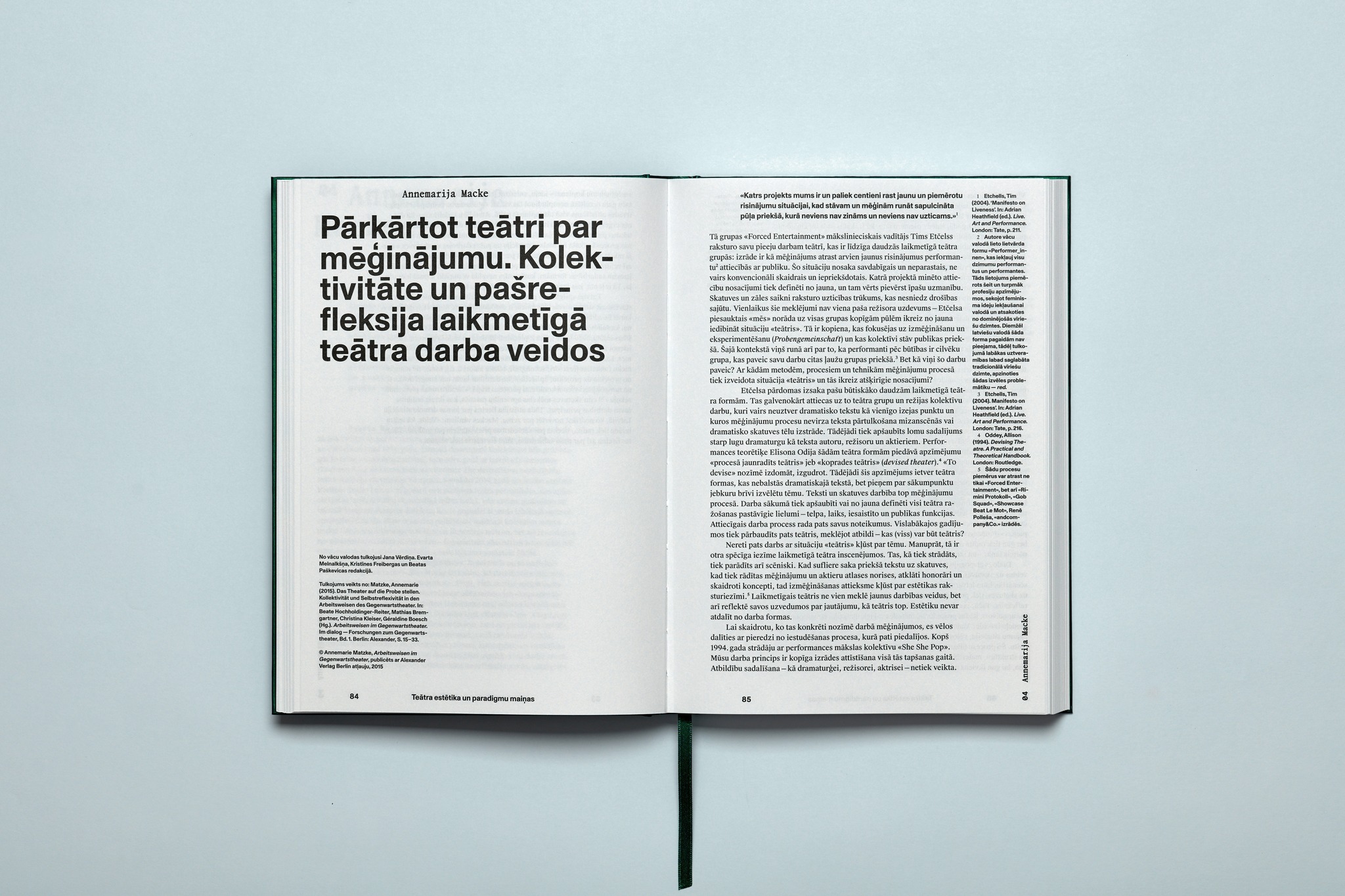 Jāatzīst, ka teksti, kuru vairums jau lasīti angļu vai vācu valodā, latviski tomēr atklāj daudz vairāk nianšu, liek izgaismoties gan jaunām sakarībām, gan pretrunām, ieraudzīt, kā aprobētais savijies ar nebijušo un ieguvis jaunu teātra formu. Šajā ziņā izcils ir Dāvida Rēznera teksts par komponēto teātri, kas duāli domā par akustisko un optisko izrādes lauku, taču praksē izpaužas grūti klasificējamā daudzveidībā. Savukārt Annemarijas Mackes pētījums “Pārkārtot teātri par mēģinājumu. Kolektivitāte un pašrefleksija laikmetīgā teātra darba veidos” ieved radošajā laboratorijā, kur organiski savijas teorija un prakse. Šis teksts, šķiet, ir visaktuālākais Latvijas kontekstā, jo atklāj konkrētus mēģinājuma procesa “spriedzes laukus”– koncepts, struktūra, materiāls, kolektīvisms un refleksivitāte.