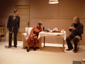 Ilzes Pukinskas, Regīnas Devītes, Janusa Johansona, Ģirta Rāviņa un Aigara Vilima atveidotais piecdesmitgadnieku pulks rāda absolūtu nolemtību un bezcerību. Katrs savā veidā degradējies, un, patiesu cilvēku vairs atgādinot tikai auguma aprisēs vien, viņi ir šai pasaulei zuduši, vairs nav spējīgi ne dot un arī ne saņemt. Vienalga vai tā būtu tikai ģimenes laimes butaforiskā fasāde (Mudrīte un Hermanis), meli mūža garumā (Modris), mīla bez pretmīlas (Tālis), konflikts ar māti un neizdevusies ģimenes dzīve (Liesma). Tāpēc arī izrādes veidotāji liek šīm personām atrasties ar vienu kāju jau tajā saulē. To akcentē scenogrāfija, kur tās autors Mārtiņš Vilkārsis ar bēšu zārka audumu izklājis skolotājas dzīvokļa sienas, kur tad arī notiek dīvainais salidojums.