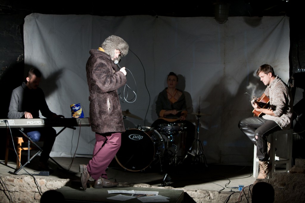 Pa izdrupušām kāpnēm uzejam cilvēku atstāta sētas nama trešajā, ja atmiņa neviļ, stāvā. Grūti pateikt, vai neremontētajās telpās senāk bijuši dzīvokļi vai kādas darbnīcas ar rūpniecisku ievirzi. Mazajā zālītē, kuras izmēri lieliski atbilst avangardiskiem teātra meklējumiem – te iespējams apmesties 40-50 skatītājiem – rindās izvietoti dažāda stila salasīti sēžamie, sākot no Vīnes krēsliem un beidzot ar padomju ēras kinoteātru un klubu kopā sastiprinātajām sēdvietām. Pustumsā vērojami melni nokvēpušie griesti un iespaidīgie fresku tipa melnbaltie gleznojumi uz sienām, kas attāli atgādina Bosha stilizācijas – melnos apmetņos ģērbtu cilvēku ekstātisks gājiens, kura vidū šķita vīdam Nāves tēls. Ar savu semiotisko daudznozīmību gluži vai fascinē skatuve: tā ierīkota, izlaužot ķieģeļu sienu uz blakus istabu – saglabātie izrobota mūra fragmenti ļauj teātri tulkot īstā simbolisma garā kā ietiekšanos paralēlās eksistences telpā. Sēžam virsdrēbēs, jo nav silts, kaut arī par dažiem grādiem tomēr siltāks nekā uz ielas.