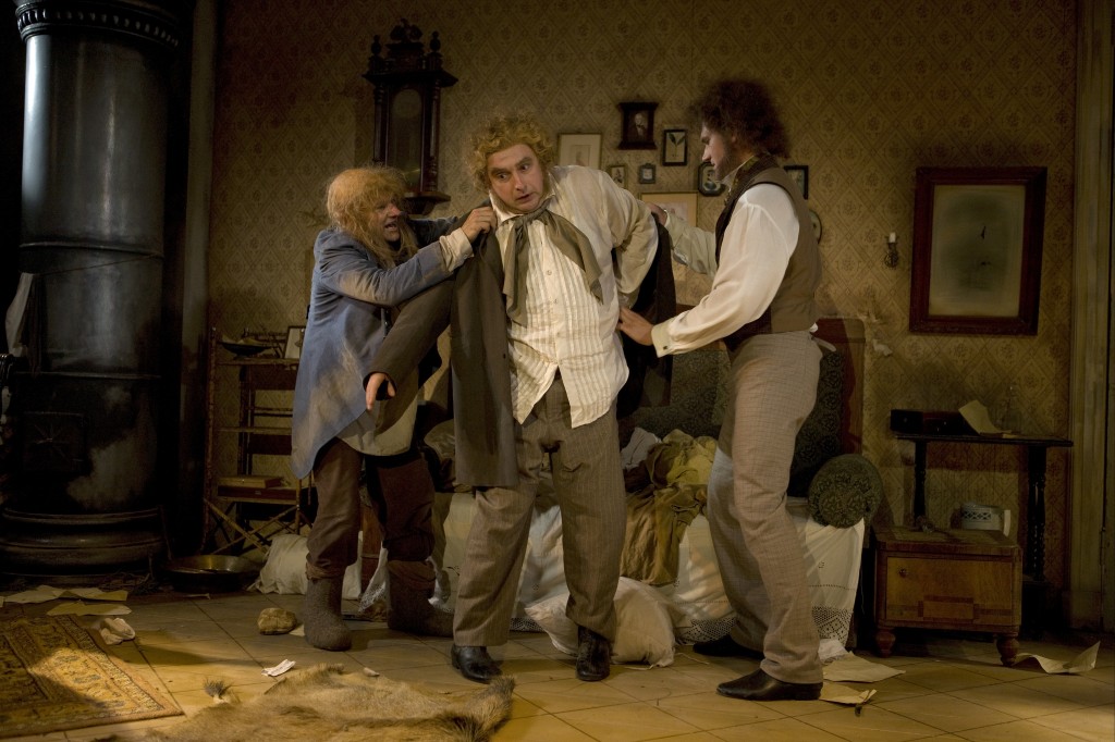 Ar Oblomovu Hermaņa izrādē ir viegli identificēties un viegli ir saprast viņa pasaules noslēgtību. Šāds cilvēks ir fatāli nelietderīgs un neiederīgs sabiedrībā, kura dzīvo pēc veselā saprāta likumiem. Sevišķi acīmredzami tas kļūst brīžos, kad Oblomova miteklī ielaužas sūtņi no ārpasaules. Hermanis romāna plašo tēlu galeriju reducējis līdz trim reprezentatīvām personām, kuras ļauj apjaust publiskajā telpā valdošos principus.