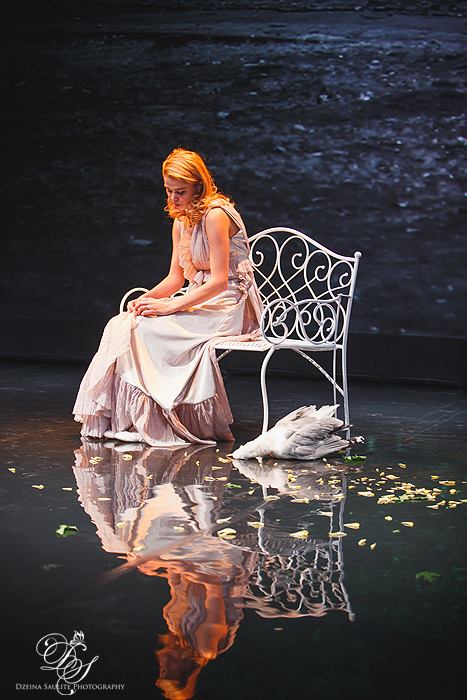 Tikai, raug, nesapratu, kāpēc, drudžaini skandējot kādreiz spēlēto Trepļeva lugas monologu, Ņina pēkšņi sāk runāt lietuviešu valodā. Vai darbība notiek mūsdienu Latgalē, piemēram, Arendoles muižā? Vai Ņinas māte nākusi no kaimiņzemes Lietuvas? Tā kā visām iepriekšējām niansēm es radu pamatojumu Čehova lugas tekstā, šo „inovāciju” varu argumentēt tikai ar spēli – work in progress. Proti: Ņinas lomu veido no Lietuvas ataicināta aktrise, ar kuru Šapošņikovs sadarbojies, iestudējot Lietuvas teātrī „Domino”, un tas, ka viņa pēkšņi ierunājas lietuviski, ir pārlieku sanervozējušās aktrises Balčiunaites „kļūme”.