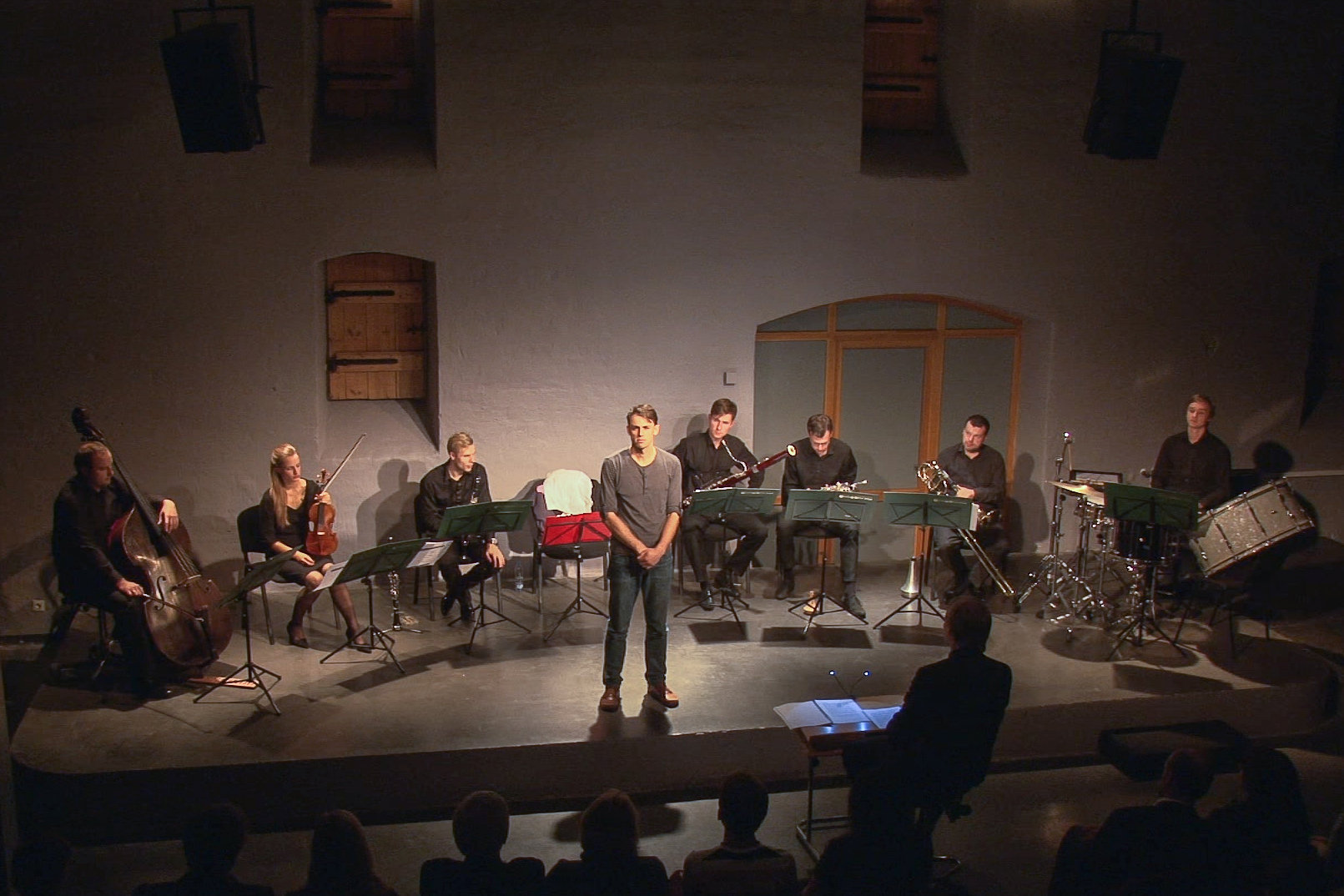 Cauri zālei, skanot skatītāju aplausiem, uz nelielās Spīķeru koncertzāles skatuves uznāk Sinfonietta Rīga mūziķi, diriģents Normunds Šnē un aktieris Edgars Samītis. Viņš iznāk priekšā, savilcis vienu uz otra vairākus T-krekliņus ar dažādiem uzrakstiem. Samītis, būdams paštēlā, jokojas, stāsta, ka par aktieri kļuvis tāpēc, ka negribējis strādāt un uz eksāmeniem faktiski aizgājis līdzi draugam, bet vēlāk sapratis, ka jāstrādā tomēr ir, un tas nozīmē pildīt režisora dotos uzdevumus. Velkot nost krekliņu aiz krekliņa, aktieris ērmojas, vaikstoties kā uzzīmētais mērkaķis, etīdēs atveidojot uzrakstus “Show Your Emotion”, “Hot Chick” vai “Welcome to the Gun Show”. Tad joki beidzas, un aktieris paziņo, ka šovakar viņa uzdevums ir mēģināt saprast, kā tas ir – būt par karavīru. Vēl viņš atklāj, ka nekad nav uz kādu šāvis un arī uz viņu neviens nav šāvis.