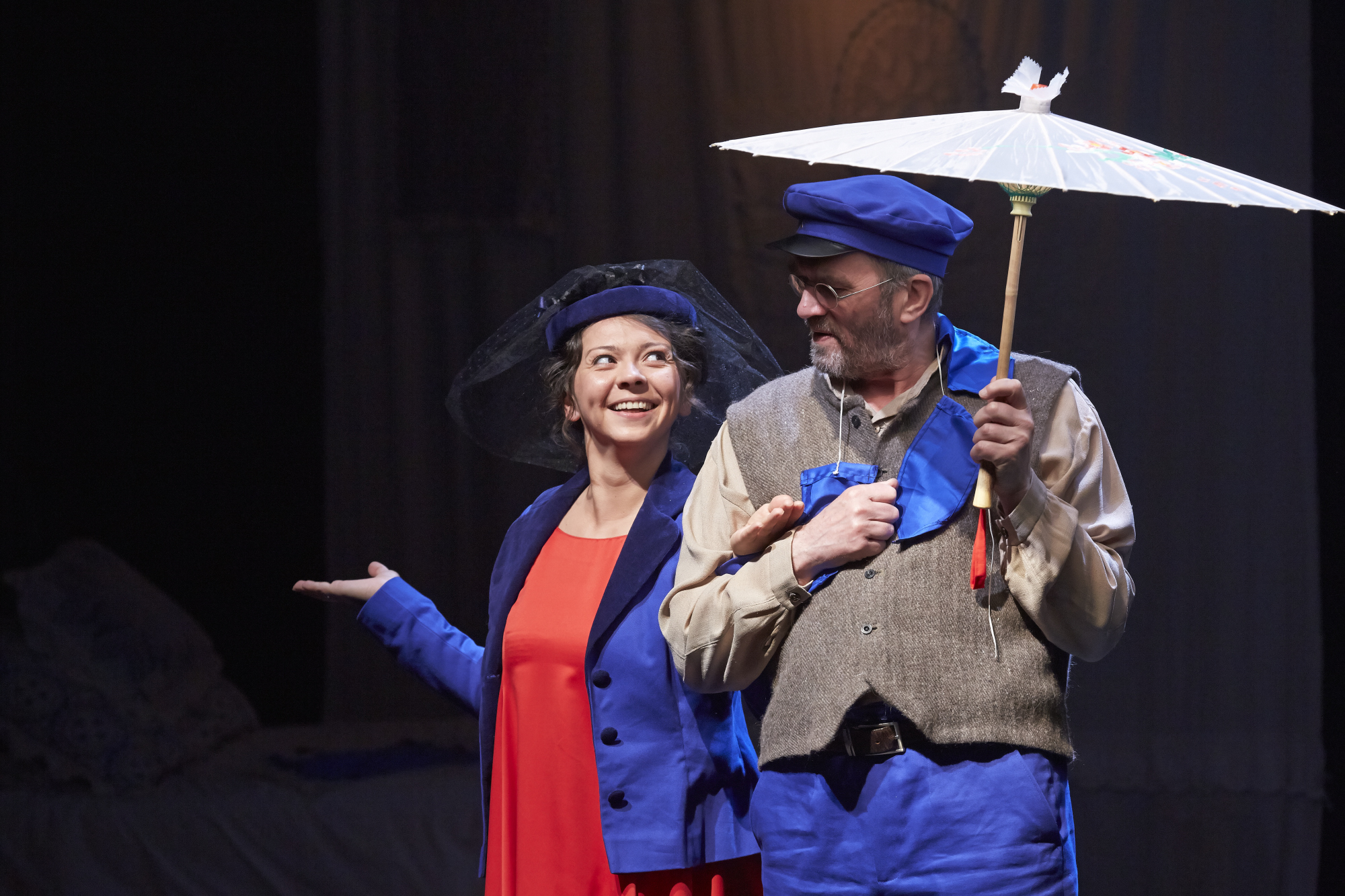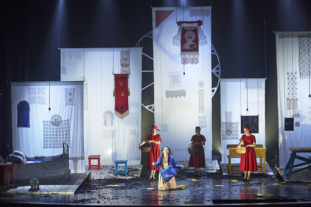 Tāpat kā stāsts, arī izrāde riņķo ap Fro. Jekaterina Frolova, parasti spilgtu raksturlomu atveidotāja, ar slaidu lēcienu nonākusi mīlētājas lomā, izgaršo savas varones emocijas pilnā spektrā. Viņas Fro ir jauna, fiziski spēcīga, neprātīgi iemīlējusies savā vīrā, kura klātbūtni nav paspējusi pilnā mērā izbaudīt. Aktrise visā izrādes garumā notur skatītāju uzmanību, savu divdesmitgadīgo varoni atveidodama kā, iespējams, mazliet naivu, bet absolūti patiesu, savai mīlestībai ziedoties gatavu jaunu sievieti. Faktiski vīrs aizbrauc brīdī, kad jūtas joprojām ir galēji sakāpinātā punktā. Vīrieša un sievietes attiecību noslēpums ir tas, kas režisoru interesē pirmām kārtām, lai arī šis nav „sterili” lirisks, bet nedaudz atsvešinātā manierē risināts mīlasstāsts. Vīriešu un sieviešu pasaules Nikolaja Slobodjanika iekārtotajā spēles laukumā iezīmē pie dažāda garuma un platuma audekla gabaliem piestiprinātie dzelzceļnieku vimpeļi un rokdarbi, bet abu pasauļu saplūšanas simbols ir milzīgs vimpelis ar lokomotīvi, kam riteņi ir tamborētas sedziņas. Savukārt kostīmi stilizē padomju strādnieku apģērbu no propagandas plakātiem, savukārt kulminācijas skatā Fro un Fjodors tērpušies baltā apakšveļā. Režisors apzināti jauc pēdas, atainojamo laikmetu iezīmējot pastarpināti – piemēram, ar muzikālo tēmu, kam izvēlēts nevis kāds padomju hits, bet itāļu partizānu dziesma „Bella Ciau” (mūsdienu skatītājam, iespējams, vislabāk pazīstama no Gorana Bregoviča repertuāra).