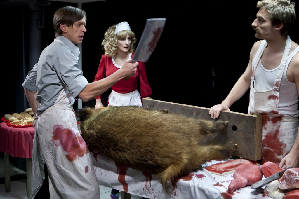Tomēr izrādes sarežģītā struktūra brīžiem mulsina. Šķiet, ka iestudējuma veidotāji gribējuši pateikt pārāk daudz pārāk īsā laikā, tādēļ pusotru stundu garajā izrādē apvienota gan radoša interpretācija par teātra „virtuves” tēmu, gan sadzīviski sociālu problēmu attēlošana 10 mazajās „izrāde izrādē” tehnikā veidotajās ainās, gan pretenzija uz dziļi filozofisku skatījumu par tādiem sabiedrībā aktuāliem problēmjautājumiem kā latviešu un krievu attiecības. Formas ziņā šīs dažādās tēmas ir nodalītas meistarīgi, jo katra no tām veido citu izrādes telpas slāni. Scenogrāfs Reinis Dzudzilo (līdzīgi kā šajā pašā spēles laukumā Viestura Meikšāna un Reiņa Suhanova tandēmā tapušajos „7 Faustos”) pilnībā izmanto Jaunās zāles telpas sarežģīto iekārtojumu, skatuvisko darbību iedalot trīs atšķirīgos plānos. Pirmkārt, tas ir tuvplāns skatuves telpas priekšpusē, kur tiek izspēlētas 10 mazās teatrālās skices. Otro spēles telpas paplašinājumu veido ar sarkaniem priekškariem norobežotais skatuves laukums, kurā atrodas aktieru grima galdiņi un kurā izrādes laikā „uzkrājas” izspēlētajās ainās izmantotie skatuves rekvizīti, sākot ar dīvānu un vannu, beidzot ar plastmasas bulciņu imitācijām. Baltais un sterilais tuvplāna spēles laukums un sarkano aizkaru drapērijas apzīmē skatītāja apziņā eksistējošos priekšstatus par aktiera profesijas (glorificēto) skaistumu. Šo stereotipu „uzslāņošanos” apzīmē progresīvā rekvizītu sablīvēšanās skatuves dziļumā kā skatītāja (zem)apziņā. Izrādes beigās emocionāli izkāpinātā veidā atklāts aktiera cilvēciskums, pakļaujot šos priekšstatus racionālai dekonstrukcijai. Aktiera glorificētā statusa izzušanu apliecina arī skatuves telpas trešais paplašinājums, kas tiek panākts, atvelkot sarkanos priekškarus un atklājot Jaunās zāles pelēkās sienas, tātad teātra mehānismu, kas iepriekš bijis paslēpts aiz butaforiski izskaistinātas ilūzijas.