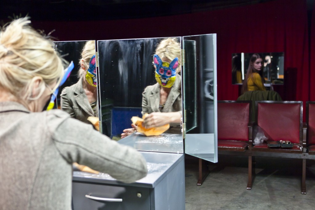 Virsroku formas un satura akcentēšanā iestudējumā nenoliedzami guvuši ārējie izteiksmes līdzekļi, kas atklāti ar brīžiem vieglas, brīžiem sabiezinātas groteskas un pilnīgas tēlu deformācijas palīdzību. Aktieru transformācijas kariķētajos tēlos notiek skatītāju acu priekšā pie skatuves dziļumā rindā novietotajiem grimētavas galdiņiem. Par aktīvāko spēles perimetru iestudējumā izvēlēts neliels laukums skatuves priekšpusē, kuru ainu starplaikos aizsedz balts priekškars. Šī ir trausla un gandrīz caurskatāma robeža starp dzīvi kā realitāti un teātra iluzionāro dabu, turklāt uz šī priekškara ainu starplaikos tiek rādīti dienasgrāmatas tehnikā veidoti videomateriāli, kuros atklājas ainu tapšanas aizkulises, varoņu-aktieru personiskās pārdomas par teātri, par aktiera profesiju un par dzīvi kā teātra (vai mākslas vispār) neatņemamu sastāvdaļu. Tas rada sajūtu, ka uz mazā spēles laukuma izspēlētās epizodes, neskatoties uz tēlu un notikumu greizo spoguļu estētikā veidoto deformāciju, savā būtībā ir īstas un patiesas.