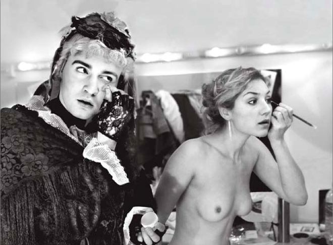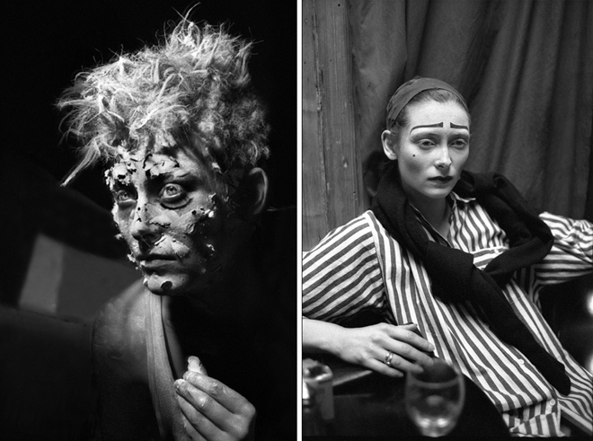 Attēlā pa kreisi - Tilda Svintone izrādē „Cilvēks cilvēkam” („Man to man”), tēlojot sievieti, kura pēc vīra nāves pieņem viņa identitāti. Pa labi - Tilda Svintone Mocarta lomā izrādē "Mocarts un Saljēri"