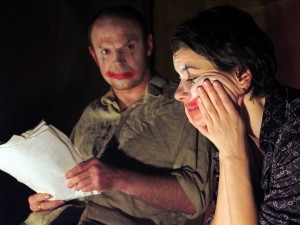 Kopumā izrādē ir trīs aktieri (Klēra Māršala, Robins Arturs, Ričards Laudons – šis bija Rīgas izrādes sastāvs, citviet izrādē piedalās citi kompānijas aktieri atšķirīgās kombinācijās), taču vienlaikus aktīvi darbojas divi – katrs no vīriešiem, nenoejot no spēles laukuma, pavada tajā četras stundas, aktrisei starp divreizdivu stundu aktīvo darbību ir divas nosacītas atpūtas stundas (nosacītas, jo aktieri, arī tiešajā jautāšanas/ atbilžu procesā neiesaistoties, sēž pie zāles izejas – viņi neseko kolēģu dialogam, bet vienlaikus ir klātesoši procesā un redzami skatītājam, kurš pamet zāli vai ieiet tajā). Aktieri tērpti neuzkrītoši (vai varbūt tieši uzkrītoši) necilos tērpos, to sejas klāj nevīžīgs klaunu grims, tādējādi radot gan atsvešinājumu, gan pietuvinājumu (pavadot kopā ar katru četras stundas, tik ļoti gribas sazīmēt patiesos vaibstus, kas slēpjas zem smiņķa).