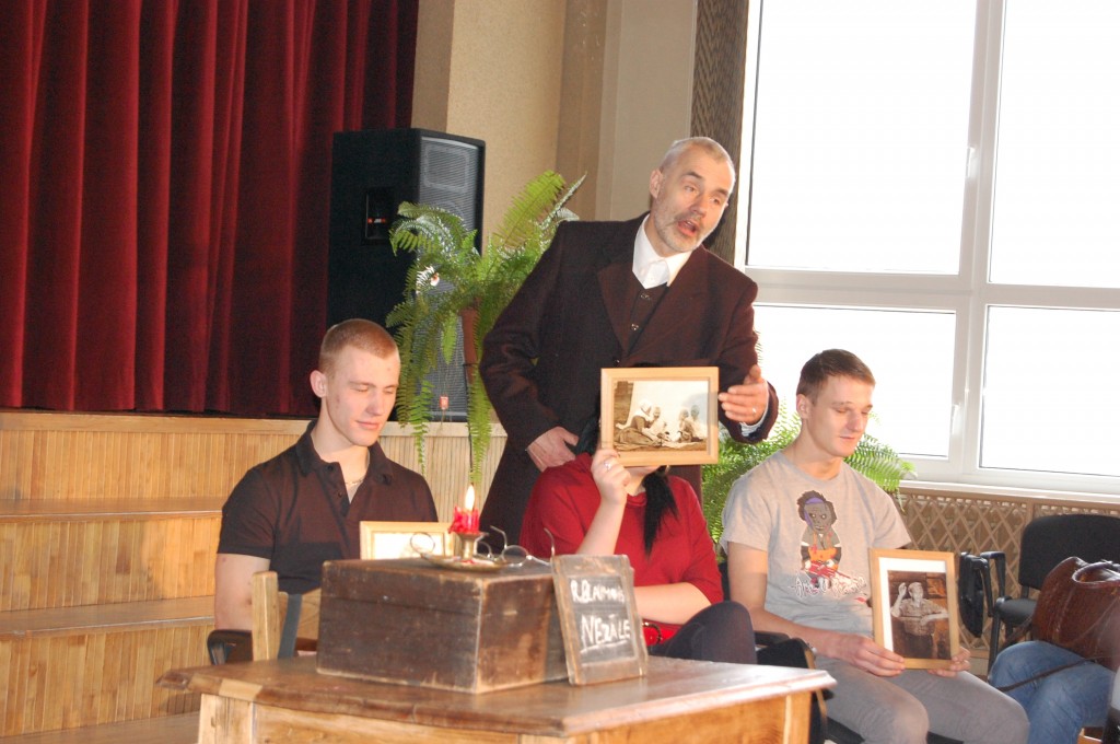 Oktobra vidus. Zemgales vidusskolas vestibils. Skatuves paaugstinājums, uz kura vairākās rindās salikti krēsli puslokā. Žvīks-žvāgs, tiek atnesta mana pieticīgā dekorācija. Ozolkoka galds, krēsls un vecs finiera čemodāns ar rekvizītiem. Skan skolas zvans, ierodas skatītāji. Es sēžu pie galda kā tāds skolmeistars. Iededzināta svece. Vēroju jauniešus. Stāv bariņš no jaunākajām klasēm un boķē.