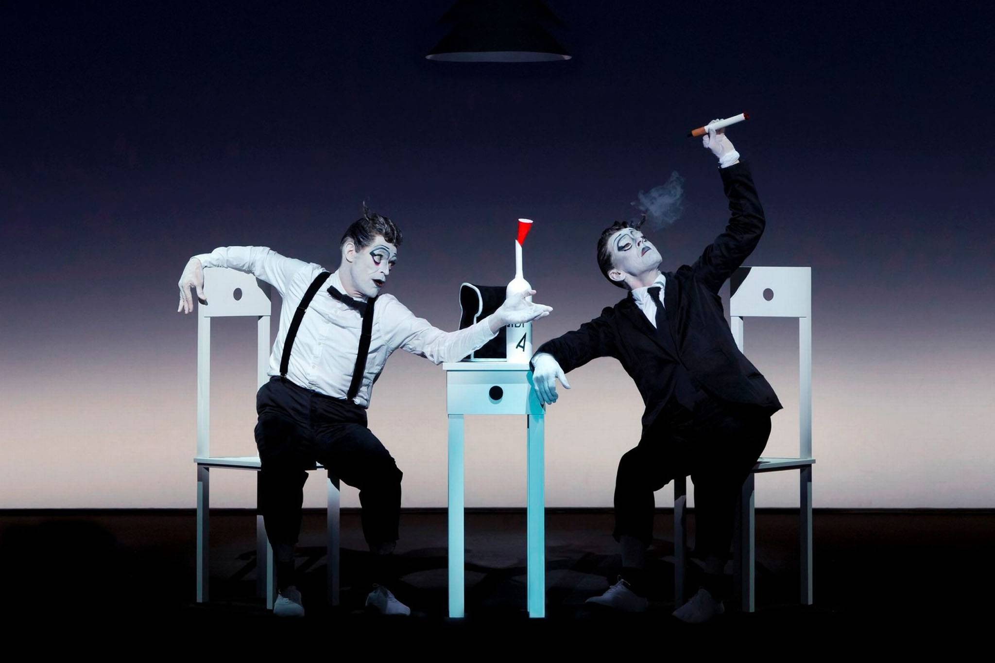 Šis personiskais konteksts palīdz labāk izprast Vilsona izrādi, kas sākas kā žilbinoša klaunāde, kur abi aktieri burtiski uzdejo uz skatuves, turklāt Vilems Defo demonstrē ne mazāku plastisku lokanību un vieglumu kā Mihails Barišņikovs, turpinās kā delartiska absurda spēle un beidzas kā smeldzīga traģikomēdija. Izrādes vizuālais tēls ir patiesi fascinējošs un iespaidīgs: Vilsonam raksturīgās izsmalcinātās gaismas, logi, krēsli un citi priekšmeti, kas maģiski pārvietojas telpā, kā allaž, liek apbrīnot gan viņa skatuves telpas un gaismu dizaina krāšņumu, gan šī koncepta tehniskās realizācijas precizitāti un meistarību. Ne mazāk apbrīnojami ir arī abi aktieri, kuru sejas rotā spilgts, klaunisks grims, mati savīti radziņā (kas viņus vērš līdzīgus nerātniem velnēniem), bet augumi ietērpti vienkāršos uzvalciņos ar paīsām biksēm. Kā divi draiskulīgi dzanni vai brīvībā izsprukuši puikas abi aktieri sēž šūpolēs, rečitējot Harmsa tekstus gan angliski, gan krieviski, dzenas viens otram pakaļ ar vecenes protēzi, kas Vilsonam, kurš mīl ikdienišķo priekšmetu transformācijas un deformācijas, protams, ir milzu izmērā. Viens no tēlainības kaskādes asprātīgākajiem brīžiem – Barišņikova deja ar protēzi kā kastaņeti, ko pavada teju publikas gaviles.