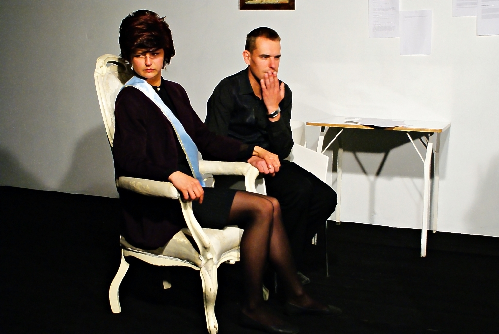 Madara Botmane Vairas Vīķes Freibergas lomā DDT izrādē "Visi mani prezidenti" (2011) // Publicitātes foto