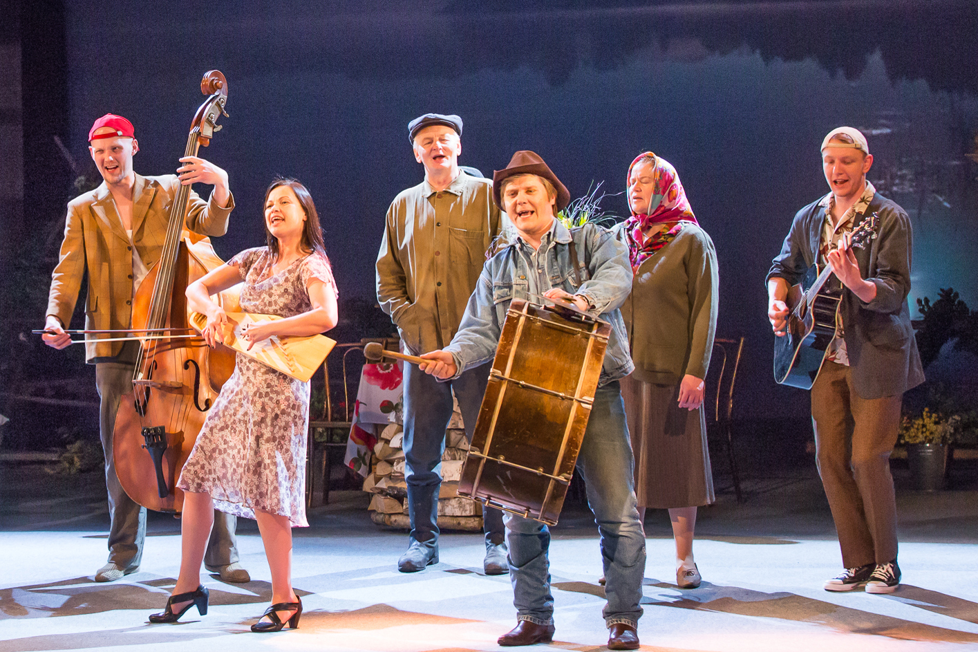 Skats no Nacionālā teātra izrādes "Latgola.lv-2" (2014). Artis Drozdovs - pirmais no labās // Foto – Gunārs Janaitis