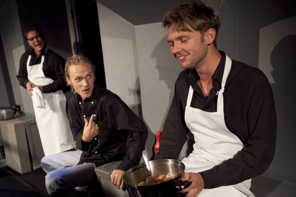 Mārtiņš Egliens, Kaspars Aniņš un Mārtiņš Upenieks Nacionālā teātra izrādē "Satisfakcija" (2013) // Foto – Dagmāra Legante