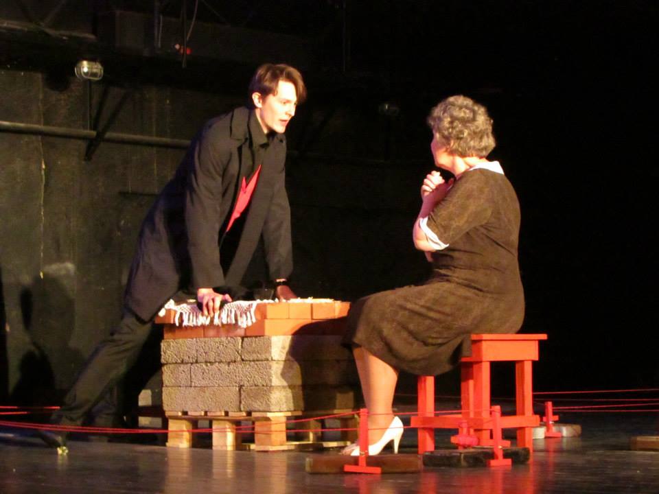 Pēteris Galviņš – Maris, Dace Makovska – Guntras māte teātra "Skatuve" izrādē "Naktssargs un veļas mazgātāja" (2014) // Foto – Linda Lagzdiņa
