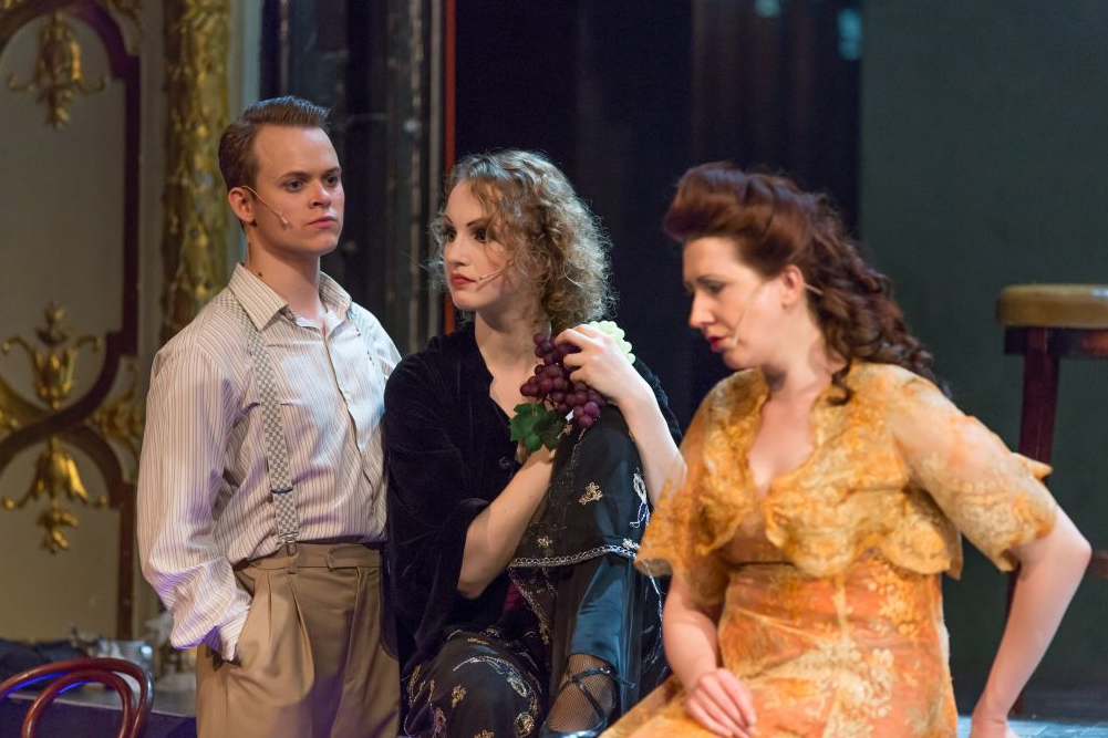 Uldis Siliņš – Klifords Bredšovs, Rūta Dišlere – Sallija Boulsa, Marija Bērziņa – Šneidera jaunkundze Nacionālā teātra mūziklā "Kabarē" (2014) // Foto – Gunārs Janaitis